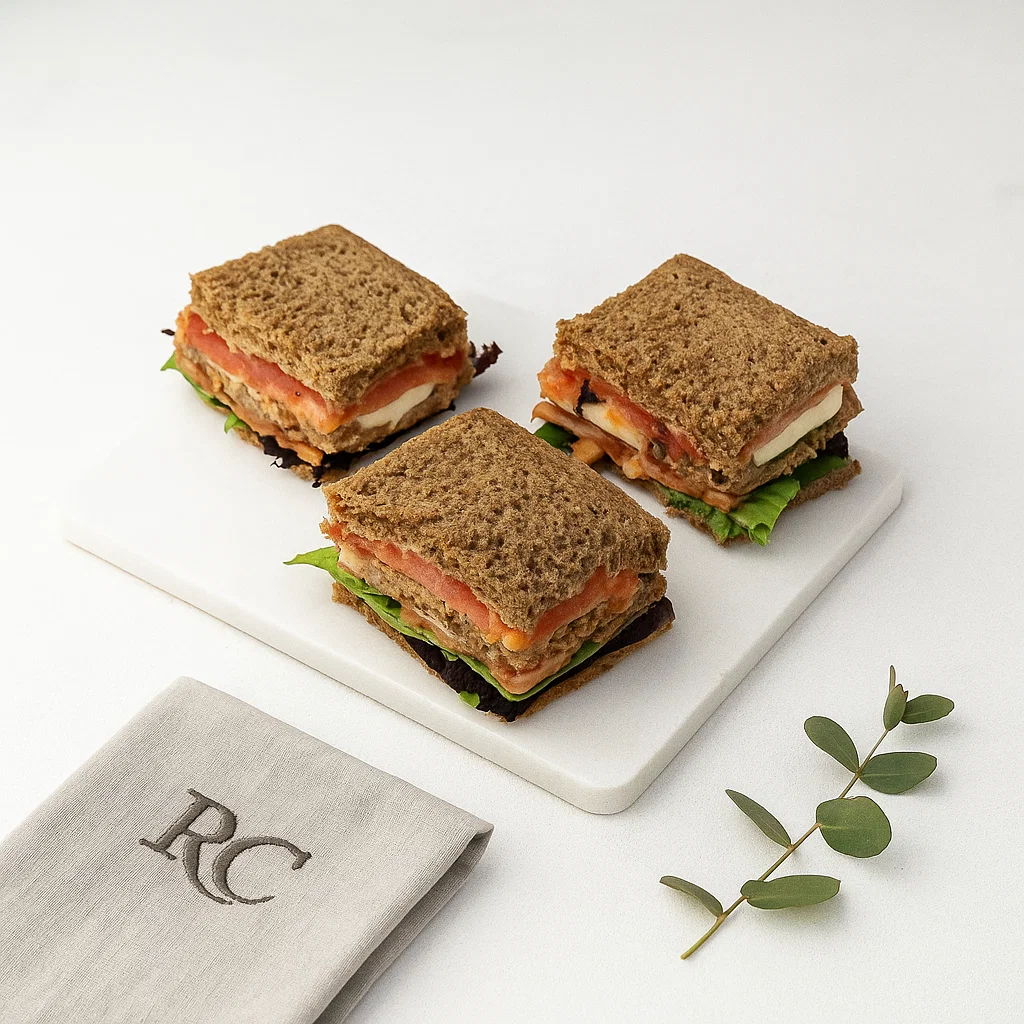Mini sándwich vegetal con salmón y huevo duro: opción fresca y equilibrada en tamaño catering, ideal para bandejas saladas, reuniones y coffee breaks en Madrid.